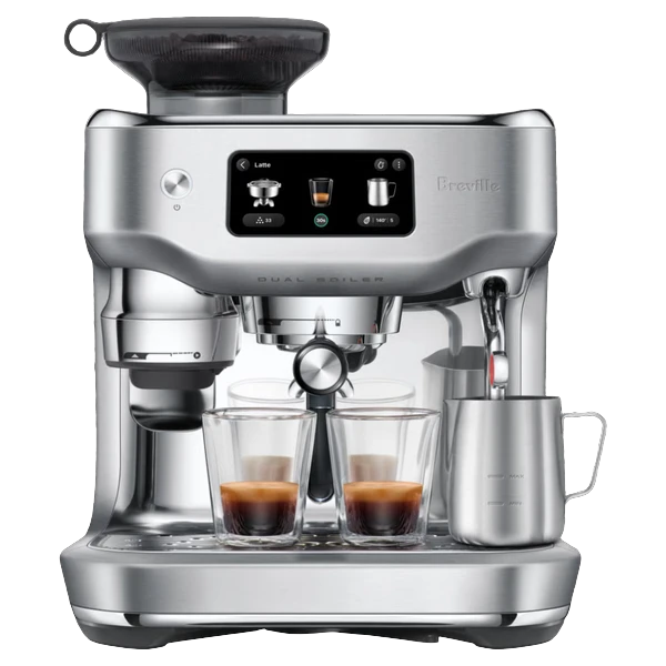 The Barista Touch | ![]() | $999.95 | 2017 | Available | Amazon | ✔ | ❌ | ❌ | Yes, built-in | 250 g (1/2 lbs) | ✔ | ✔ Touchscreen | 30 levels (dial) | ❌ | 5 preset recipes, 8 custom drinks | Manual only | 15 bar | 9 bar | Yes; 1/2 cups | ✔ | ✔ | ✔ 89-97°C via screen menu | ✔ Instant | ✔ | 2 L / 67 fl oz | ❌ | ❌ | Automatic or manual | 40-75 °C, 5 °C steps | 8 levels | ❌ | ❌ | ✔ | ✔ ThermoJet (3s) | ❌ | ❌ | ❌ | ❌ | ❌ | ✔ 30 mins | 1680 W | 32.0×41.0×32.0 | 12.6×16.1×12.6 | 10.3 | 22.7 | Brushed Stainless Steel, Black Truffle, Sea Salt, Black Stainless steel, Damson blue | ✔ 54 mm | ✔ single & dual wall, 1 & 2 cups | ✔ magnetic | ✔ | ❌ | ✔ | ✔ | ✔ | ✔ | ✔ | ✔ | ✔ | ✔ | ✔ | ❌ | ❌ | BES880 | Instruction book | Breville.com |